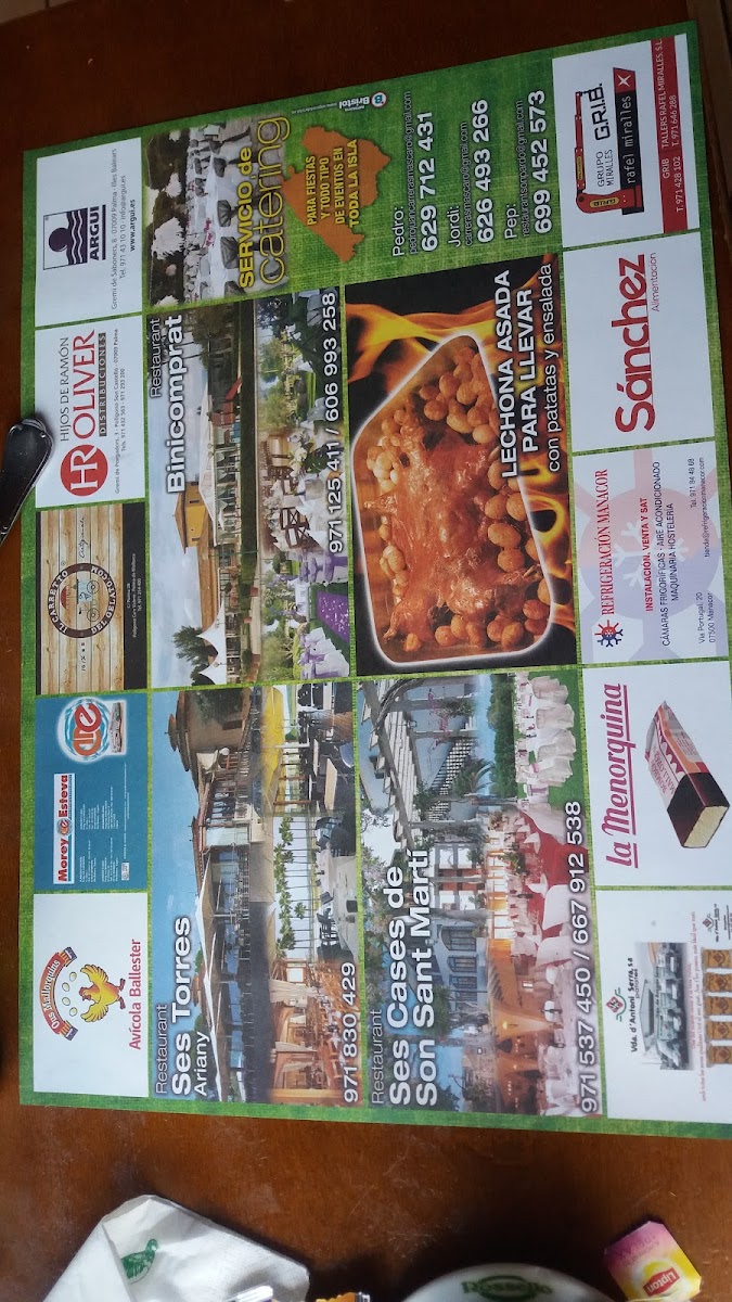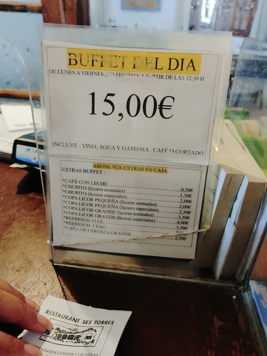“ UPDATE (lunch buffet experience) I tried their all you can eat, and I can say they are very generous. You get to try all kinds of Spanish dishes, from meat, fruits to desserts. All food were delicious and not salty, and I love the paella! You are seated to your table and given a wine (Red, White or Rose); a fizzy drink Lemonade and water, all included in the buffet price, you also get a complimentary coffee at the end. Price of buffet was €15 per person. Good local restaurant. (Dinner Experience) I ordered the pizza no 12 which was the Ses Torres. Ses Torres is the famous suckling pig well known in the town. The taste for the pizza was nice, in fact the restaurant is popular for its buffet and pizzas. Partner ordered the lamb shoulder, which was slow cooked. I would not recommend this. Though you get it with side dish of either potato or chips. It comes with salad if you want. We had beer which is Estrella Damm, taste so refreshing and crisp. I also ordered orange juice which was freshly pressed. You are also given complimentary sidedish of olives, bread and sauce. The olives taste nice, they have seed inside. The sauce is very good!! But the bread was not good because it is hard in terms of texture (unless it is meant to be like that). The staff were nice, especially Nachos, he was very lovely to us, we sat outside which also had sunset view. Price of the food was decent. Pizza range from €9 to €14.50. Ses Torres pizza cost €13.25. Lamb shoulder was very expensive €19 but not worth the taste, unless you don't mind slow cooked. The pint of beer and orange juice were €3 each. We did not try dessert. Lots of parking space, easy to get to restaurant. There's a play area outside for toddlers. ”
